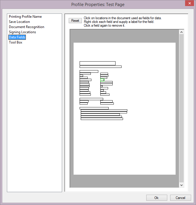 The property page only shows the outline(s) of the text in the document, not the graphics or the actual text value(s). All we need to do is to find the rectangle that contains our value (keep in mind this will be in exactly the same place for every "instance" of this document). Once found, we click on that rectangle, and we have created our first data field (it turns green). We click on the 4th field down in the right column, that is the "text box" that will contain our value. Figure 3 shows our progress. Note: Actually, you can click and drag out a box on the document over any number of existing text areas. At run time, when the document is being processed by tools that use Data Fields, the contents of the Data Field thus defined will actually be the concatenation of the contents of each of the text areas from the document enclosed by the box you drag out in the field editor.