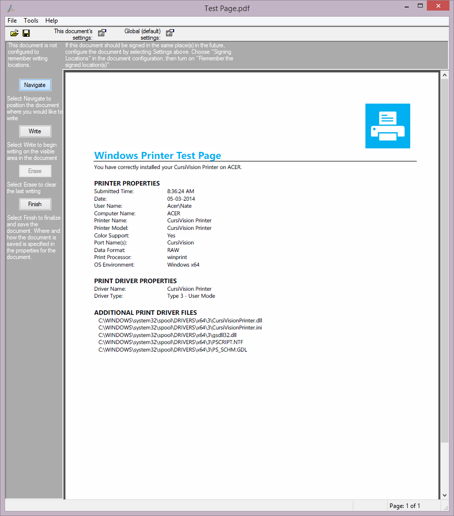 CursiVision can take data directly from your documents and use it in powerful ways.Some of the Toolbox items leverage this ability for naming the resulting signed document, or for populating cells in a logging worksheet, for example.To define fields, open the document in CursiVision and select the Document properties icon in the Toolbar. Or, if you print your document to initiate signing, edit the Print profile. Recall that you can find the print profile by selecting Global Properties - then "Print to sign", find the profile in your list of profiles, and click Settings beneath the profile list. First, we show a particular document that we are working with to read data from. Figure 1 shows the Windows printer test page we sent to the CursiVision printer, as displayed in CursiVision ready to sign.
