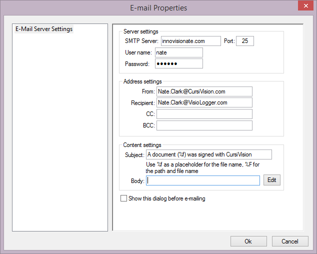 Note that the E-Mail tool works using simple SMTP communications with some mail server, visible, of course, to the computer wich is running CursiVision at the time of document signing. This also means that the tool does not use any local e-mail client to send this mail, it talks directly with the mail server defined. Our example has the property values provided already, you should, of course, change these based on your locally available mail server. Now, when the document is signed, an e-mail, with the document provided as an attachment, will be sent to the configured recipient. That e-mail will come from the configured sender. Note also that our subject line contains a placeholder for the document name using a lowercase %f sequence, or an uppercase %F sequence which would indicate to the recipient the exact location of the signed document. Usage instruction for other tools from the CursiVision Toolbox can be seen here: