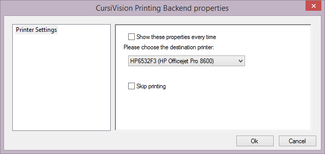 The only setting for this tool is to select the destination printer. Note that the destination printer could be a network shared CursiVision printer on some other machine on the network. Printing to that printer would bring up CursiVision with a ready to sign document on the computer sharing it.