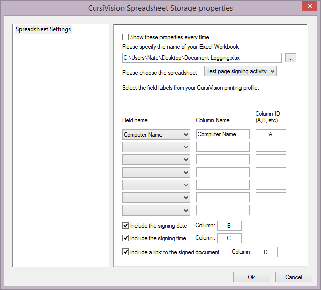 You could create "global" settings for the Spreadsheet tool by clicking the "props" button on the lower list. If you do this, merely place the Spreadsheet tool into service for each print profile or document settings, and that instance will carry forward the settings from the global instance of the spreadsheet tool. If, however, the global settings change in the future, you would want to "un" use and then re-use the spreadsheet tool into your particular documents for them to "see" the new settings. All of the "global" tool instances work this way. Much of Figure 2 has been filled in with values. In our Data Fields tutorial we created a "Computer Name" data field from the Windows Test Page, here is where we put that data field to use. In these settings, you specify the name of an existing workbook, choose any spreadsheet from that workbook, then proceed to map the data fields defined onto columns in the worksheet. You simply indicate into what column, using standard Excel ABC notation, where the data from the field will be placed. The tool will also label each column with the value to the right of the data field selection in Figure 2. This label can be anything, or left blank. While providing these properties - you can go back to the Data Fields page to create new fields if you need to. Then, upon re-visit to the Spreadsheet properties page, those fields will be ready to use. You can also log the date, time, and document save location of the document as well, simply indicate the column into which these values should be placed, we are using columns B, C, and D. That is all there is to it! Note in Figure 3 we show the results after signing our Windows Test page whose print profile settings we have setup through these examples. Remember that this is also completely automatic - once the Spreadsheet tool is setup, no action is required on anybody's part, the data simply logs into the spreadsheet in the background.
