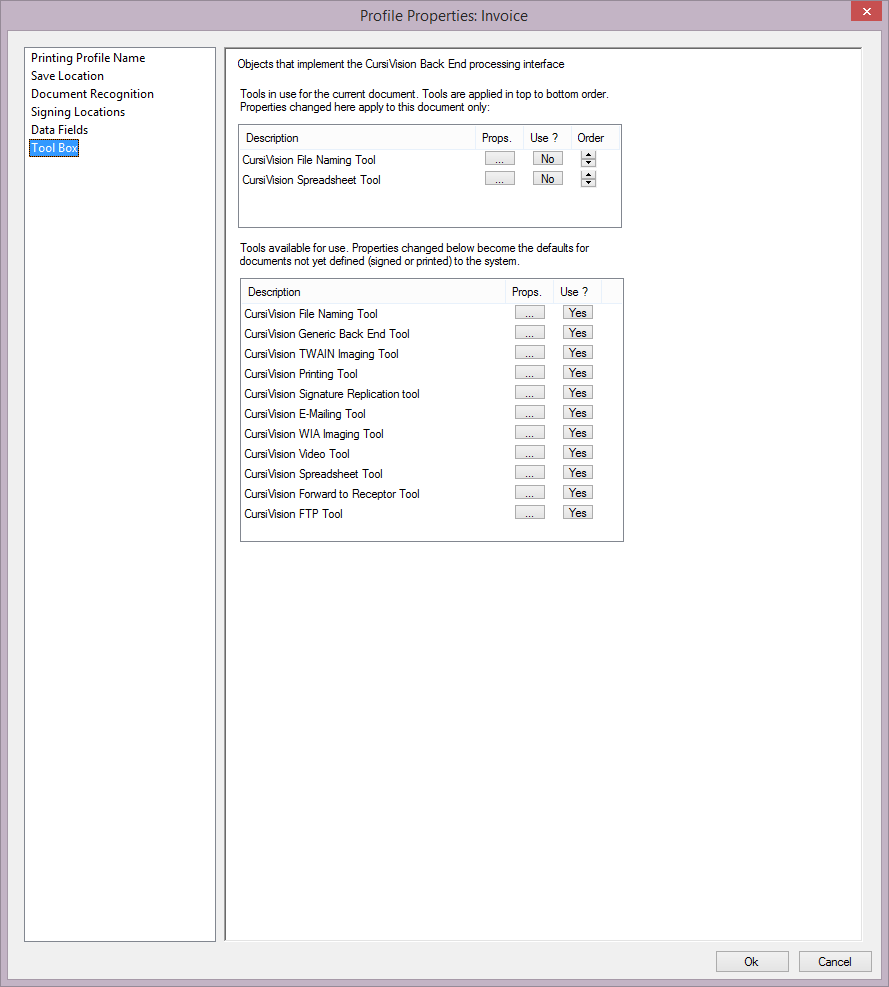 Note in the above figure that 2 tools have been chosen for use in this print profile. I know it is a print profile, because the title bar in the settings dialog indicates it is for the "Invoice" print profile. Don't be confused by the presence of the "No" button in the top list in the "Use" column. That button means to take the tool back out of the list. You use the tool by selecting Yes in the bottom list, "un" use the tool by selecting No in the top list. The "File Naming" tool was placed into use because I clicked on "Yes" in the lower list which placed the tool in the upper list. Note that I can use any number of tools - even repeating them, and that I can easily change the order in which they are used. For example, if I'm going to use the File Naming tool (which can name the resulting signed document based on content in the document) and the WebCam tool (which embeds a photo in the document), I want the WebCam tool used first to be sure to get the photo in the final result. On the other hand - did you know that most of these tools also have the ability to save the document? This means that you can have each tool save their own copy of the document which may be different than other copies. Simply put, the list of tools in use characterizes a chain of events. The order of tool execution may indeed make a difference in the final document. You should probably ensure, however, that you have one of the "file saving" tools near the bottom (last execution) of the list in typical circumstances. Unless, of course, you want to have multiple documents saved. If none of the tools are configured to actually save the document, the main "Save Location" category settings will pick up the omission and save the document per it's settings. An excellent example of that would be saving forms in multiple places with distinct names taken from the actual document. For example, you could save a signed invoice by invoice # in one location, and also save the exact same document by customer name in yet another location. There is no restriction at all on how many times and/or combinations of these tools chain together. A note about propertiesThe "Props" button in each of the two lists are used to set the properties of each tool. Such as Save location (if it saves a file), Camera to use, etc. When you set the properties of a tool in the lower list - you are setting the "Default" properties for that tool. Then, if you use that tool for a particular document in the future, those properties will become the properties for that instance of the tool for that document. Setting the Default properties of the tool does not change the properties for instances of the tool already in use for other documents. Similarly, setting the properties using the button in the top list means that you are changing the tool's settings for that document (or print profile) only except when you put tools in the top list when you are changing the global settings - in which case you are saying that all future documents are to use this tool. For more information on the CursiVision tools, please use the following links: